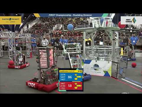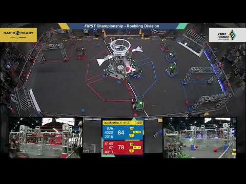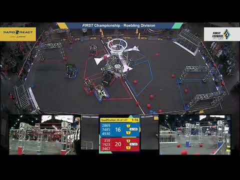 359(Hawaiian Kids)のロボットが壊れ、インテイクが落ちるというかなり激しい試合でした。359は私たちが参加したHawaii RegionalでRank 1を獲得しているかなり強いチームなのですが、この試合では2869(Regal Eagles)の激しいディフェンスによって実力をほとんど発揮できないどころか試合後半で機構が壊れてしまっていました。FRCでは基本的にロボット同士が壊し合うことなどはないのですが、Championshipほどのレベルになってくると動きが激しすぎてこのようにパーツや機構が落ちることも珍しくありません。そうとは言ってもやはり壊れてしまったインテイクを引きづりながらもう1方のインテイクを使って一生懸命CARGOを入れるロボットの姿は痛々しかったです…